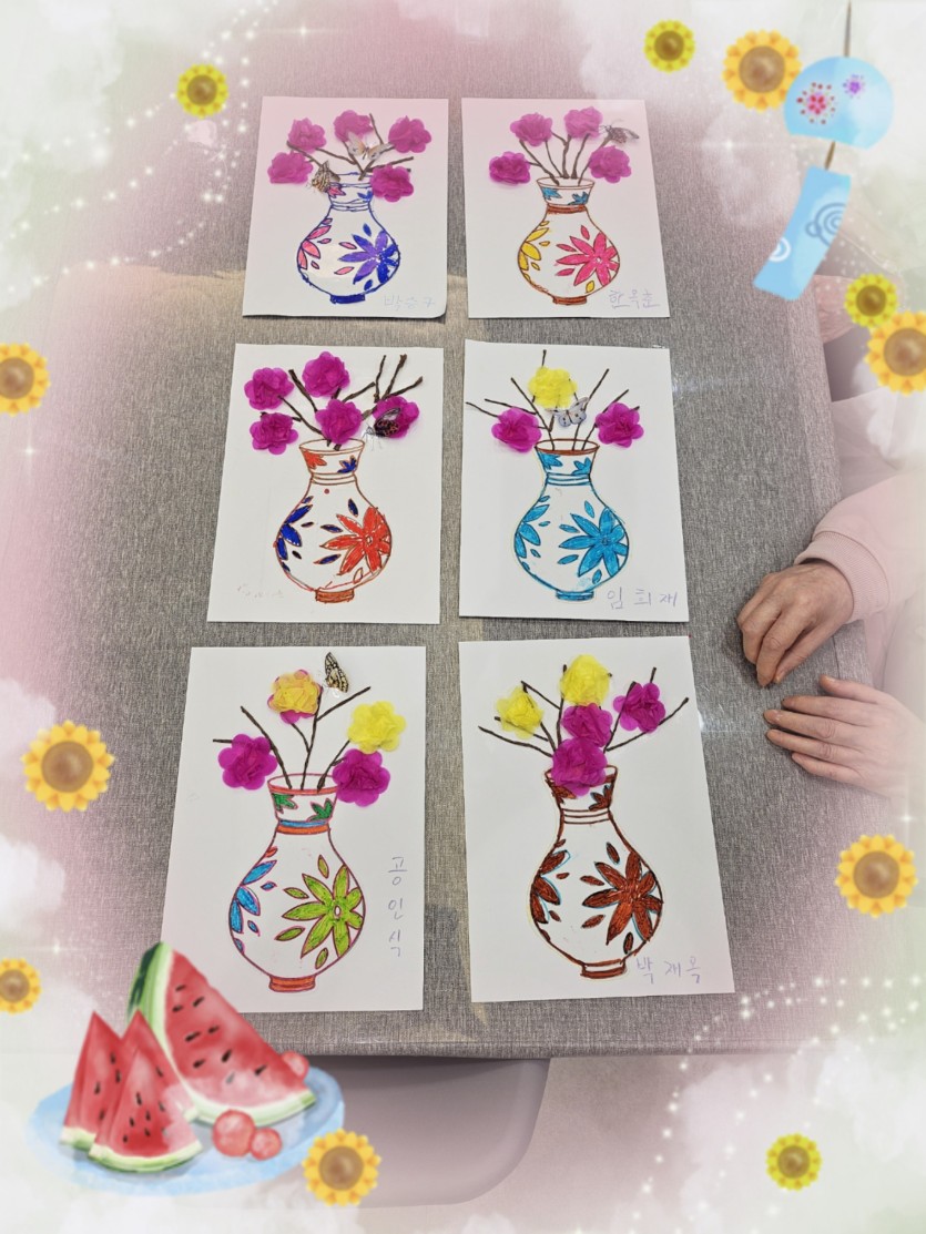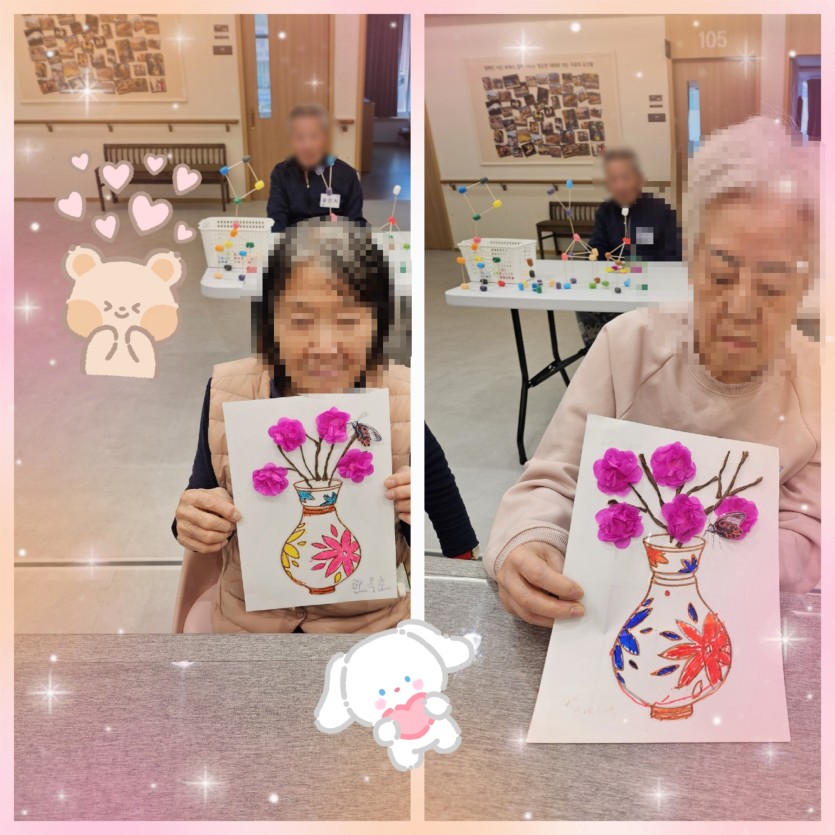 오늘 어르신들께서는 청화백자와 매화나무 꾸미기 활동에 적극적으로 참여하며 미술 활동의 즐거움을 느껴보았습니다.